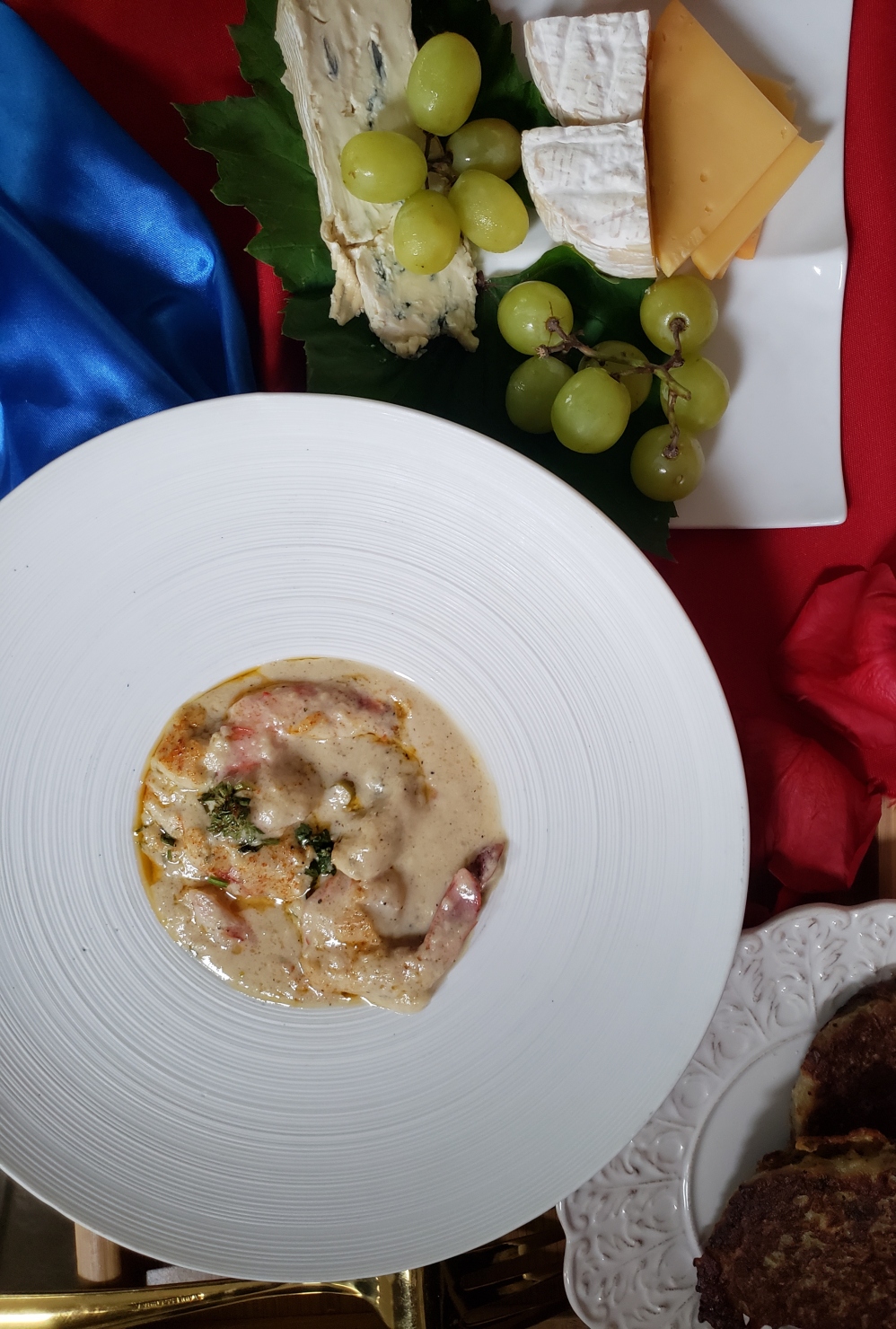 The hot selections were equally diverse, and included Escargot (tender and flavourful snails cooked in garlic, parsley, salt, fresh cracked black pepper, butter, lemon juice and olive oil paired with croustades and German style ale bread), Jambon en Croûte with Port Wine Sauce (slices of ham simmered in a flavoured broth, then coated in mustard before being wrapped in puff pastry and baked), Shrimp in White Wine Sauce (large shrimp cooked in a rich thick sauce containing finely chopped vegetables, herbs, butter, fish stock, and Luxembourg Riesling), Bouneschlupp (a classic Luxembourg soup with green beans, potatoes, smoked bacon and onions accompanied by potato pancakes and sour cream), and lastly, but certainly not least, Chicken & Mushrooms in Bechamel (chicken sauteed in butter and then braised with shallots, garlic, cognac, mushrooms, parsley, and Riesling wine, with a ‘liaison’ of cream and egg yolks for richness at the end).
