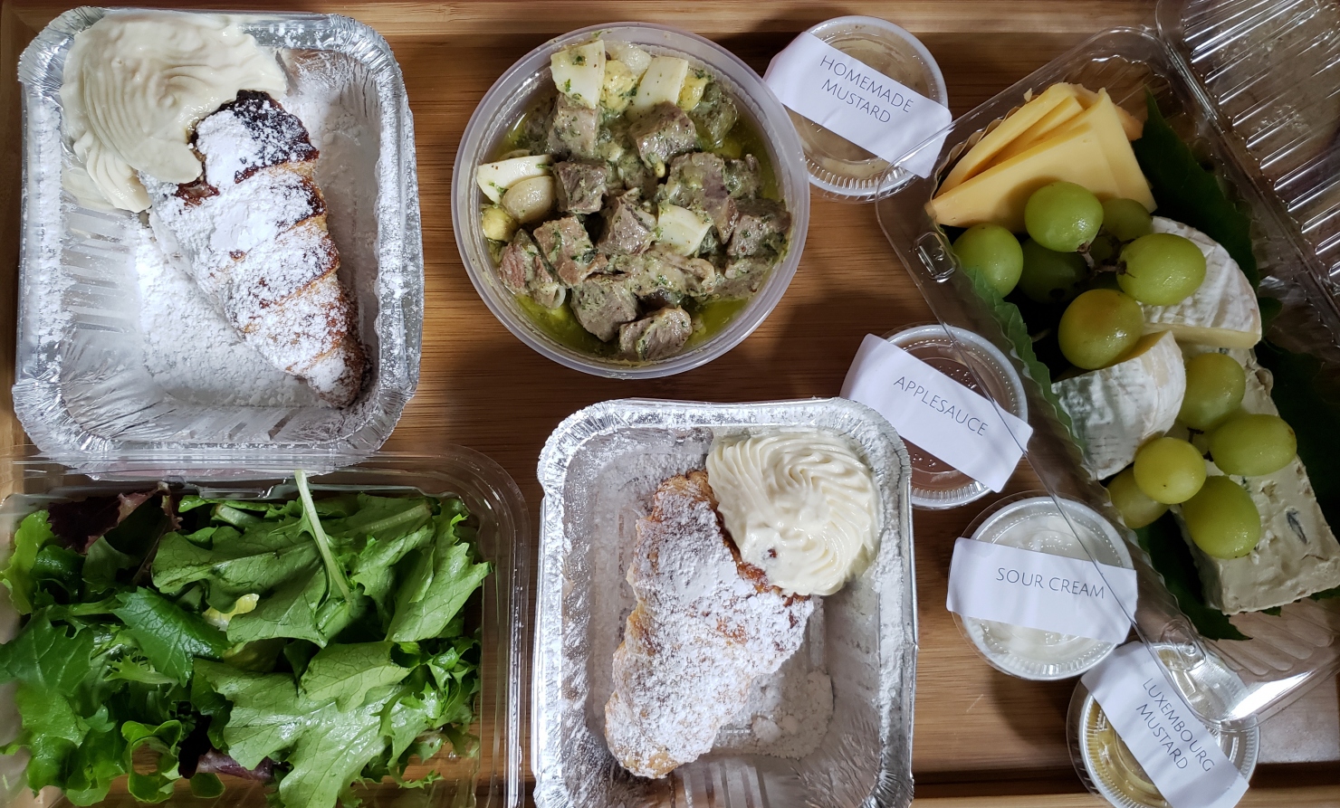 Each catered meal includes a hot and cold box. The Luxembourg menu came packaged with real vibrant rose petals scattered on top, an ode to the fresh flowers that grew in great abundance around the country. And, the cold selections included an assortment of local delicacies, ranging from Firestone Salad (a flavourful mix of beef, pickled onions, capers, gherkins, boiled eggs, and fresh herbs), German and French Cheeses (camembert, cambozola and edam accompanied by white sweet grapes), an assortment of sauces (Luxembourg mustard, homemade mustard and homemade applesauce), and Cream Horns for dessert (handmade puff pastry filled with pastry cream).