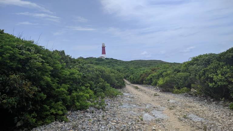 After ten minutes on the road, Marcus made a quick left turn onto a side road, which I learned about from my research, yet sorely underestimated. The beginning of the road that leads to the Hole in the Wall Lighthouse is lined with pine trees; it’s almost as if the pine trees are a big bear hug welcoming you to the other side. As the ride continues, the welcoming committee that were the pine trees slowly thins out, then disappears. When they disappear, your cell phone service disappears and it’s you, the wilderness and your thoughts. As we drive deeper into the wilderness, Marcus begins to explain to me the layout of the land that leads to the lighthouse. According to him, the bushes further up the trail were low coppice and because of the nature of the vegetation, the soil wasn’t soft enough to plant pine trees, which explains the absence of pine trees.