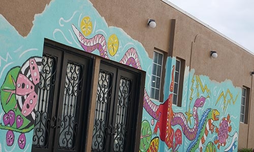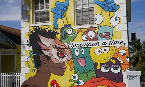 Nestled comfortably on the grounds of the Marriot Courtyard, this mural is divided into two parts, one which you can pose directly in front of and the other which you have to hop a wall to do an adventurous shot. This is one of our personal favorites as it's the best shot to let all your friends know you're in The Bahamas kickin' it. Whether you choose to stretch on the wall or let your legs dangle, this mural by Richardo features some of the best of what we offer, in the most colorful way.
