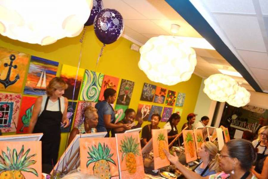 Just off to the side of the side of the gallery was a bar. My husband, the perfect gentleman, got our wine as we waited for the class to start. A few minutes later the owner of the studio, Gennyne, stood at the front with her own blank canvas. She told us we were going to paint a pineapple.
