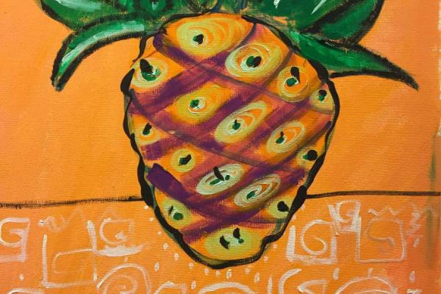 First we mixed orange and white paint and slathered the entire canvas with the shade of peach we’d created. Both my husband and I excelled at that task. Next we had to draw the outline of the pineapple. I drew a large oval, but my husband, well, he must have thought we were painting a strawberry. His outline resembled a rounded triangle.