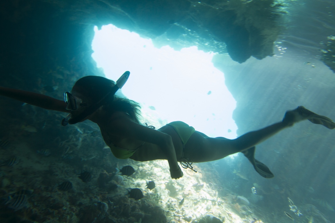 We headed to Thunderball Grotto, made famous for its appearance in the James Bond movie Thunderball. It may well be the most interesting place in the world to snorkel. Hundreds of fish live inside the grotto under its aquamarine waters. Our tour group spent the better part of an hour inside the cave.