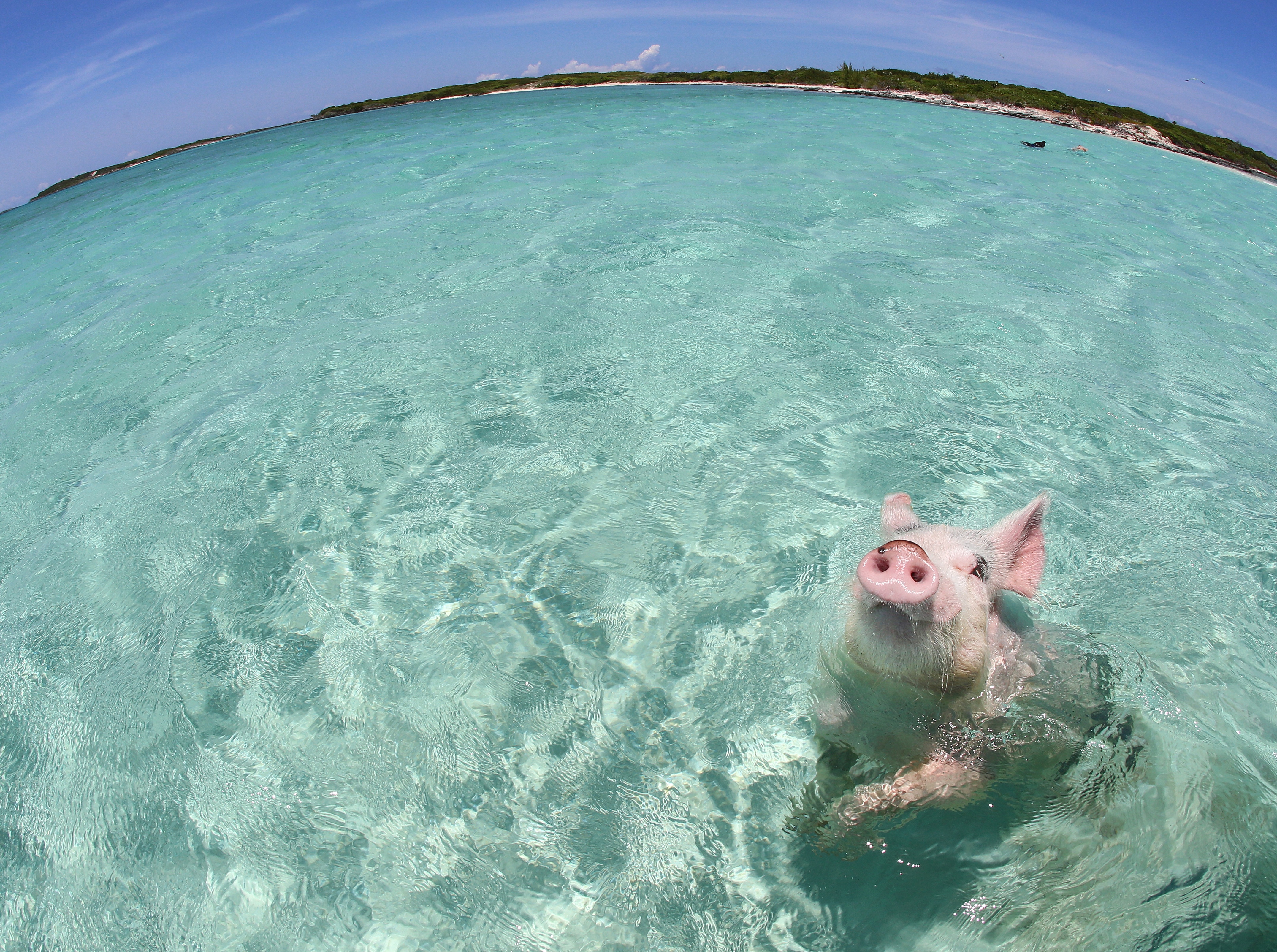 When our boat approached the island, the pigs started swimming to us. They are so accustomed to visitors that they think nothing of it. Guests bring vegetables, bread, and even beer for the pigs.